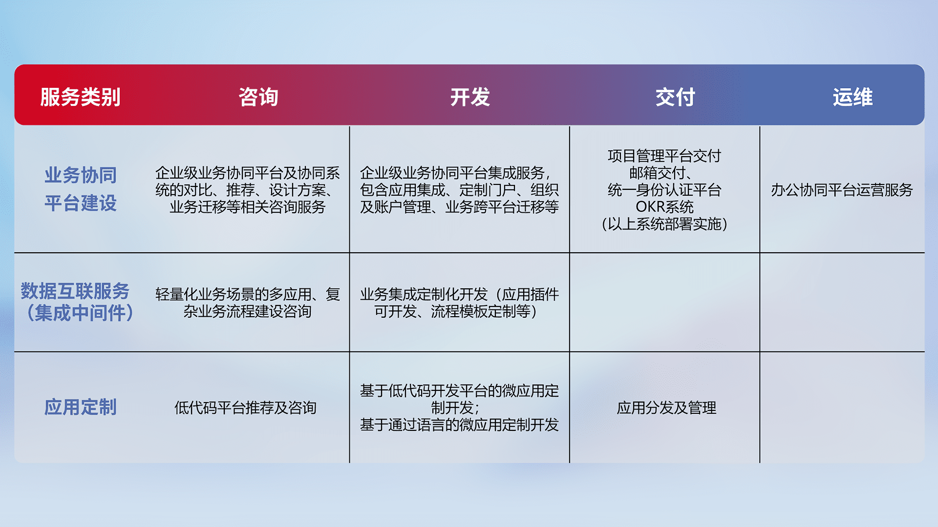 针对钉钉、、、、企微、、、、IDaas等平台级产品提供产品的规划、、方案、、、交付、、、定制化开发等服务,,实现如统一协同办公、、、智能客户服务、、混合会议管理、、、智能数据查询、、、等业务场景,,实现数字化转型。。。。