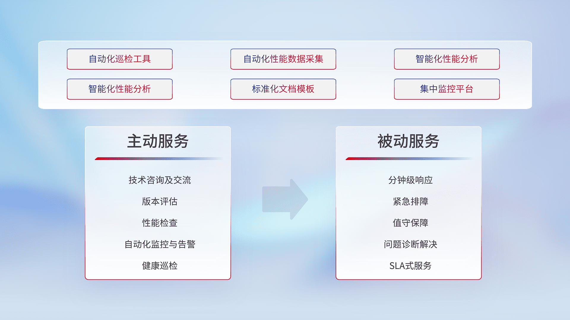 智能化工具和标准化文档,,,,保障服务质量,,,提供主动服务(包含技术咨询、、、、版本评估、、、、性能检查、、、自动化监控与告警、、、健康巡检)和被动服务包含(分钟级响应、、、紧急排障、、、值守保障、、问题诊断解决、、SLA服务)。。。
